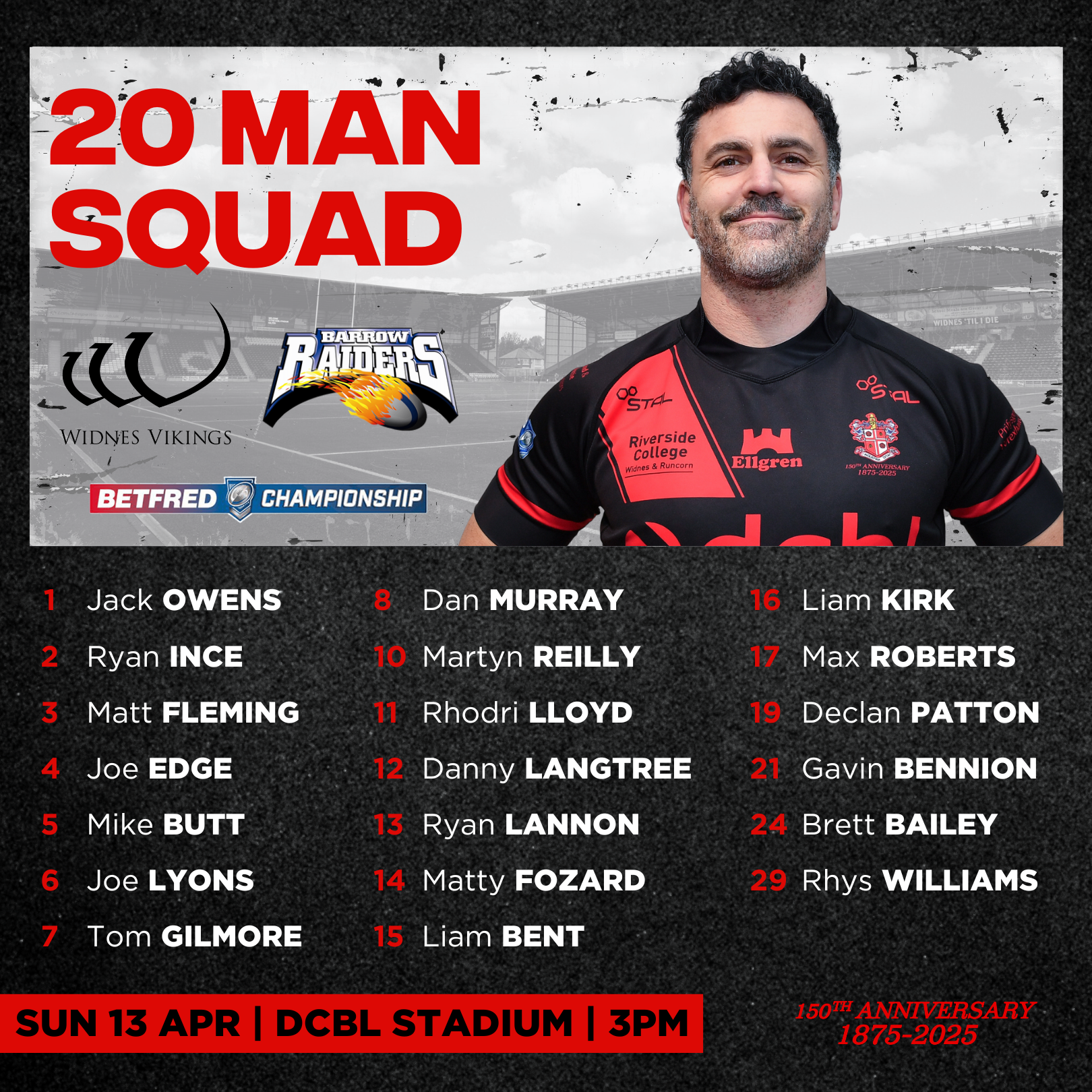 Allan Coleman has named a 20-man squad for Sunday’s clash with Barrow Raiders at the DCBL Stadium. The match is scheduled to kick off at 3pm as the Vikings look to bounce back. Vikings Squad v Barrow Raiders 1 JACK OWENS (TEELING MANAGEMENT) 2 RYAN INCE (TEELING MANAGEMENT) 3 MATT FLEMING (LENA HOUGH IN...Read More