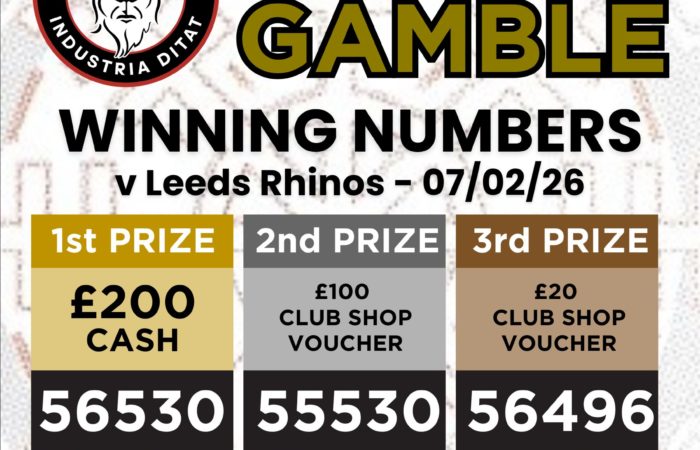 Here are your Golden Gamble winning numbers from our clash with Leeds Rhinos. 1st Prize (£200 Cash) – 56530 2nd Prize (£100 Club Shop Voucher) – 55530 3rd Prize (£20...Read More
