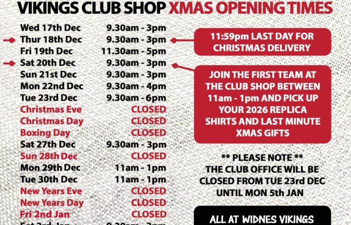We can confirm the opening hours of the Vikings club shop over the festive period. Our club shop boasts a range of festive stock, including our brand-new 2026 home and away...Read More