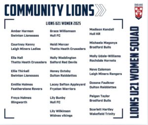 Fullback Hannah Quirk has been named in the England Community Lions Women’s Squad, while hooker Lily Wilkinson has earned her place in the England Community Lions U21 Women’s Squad.