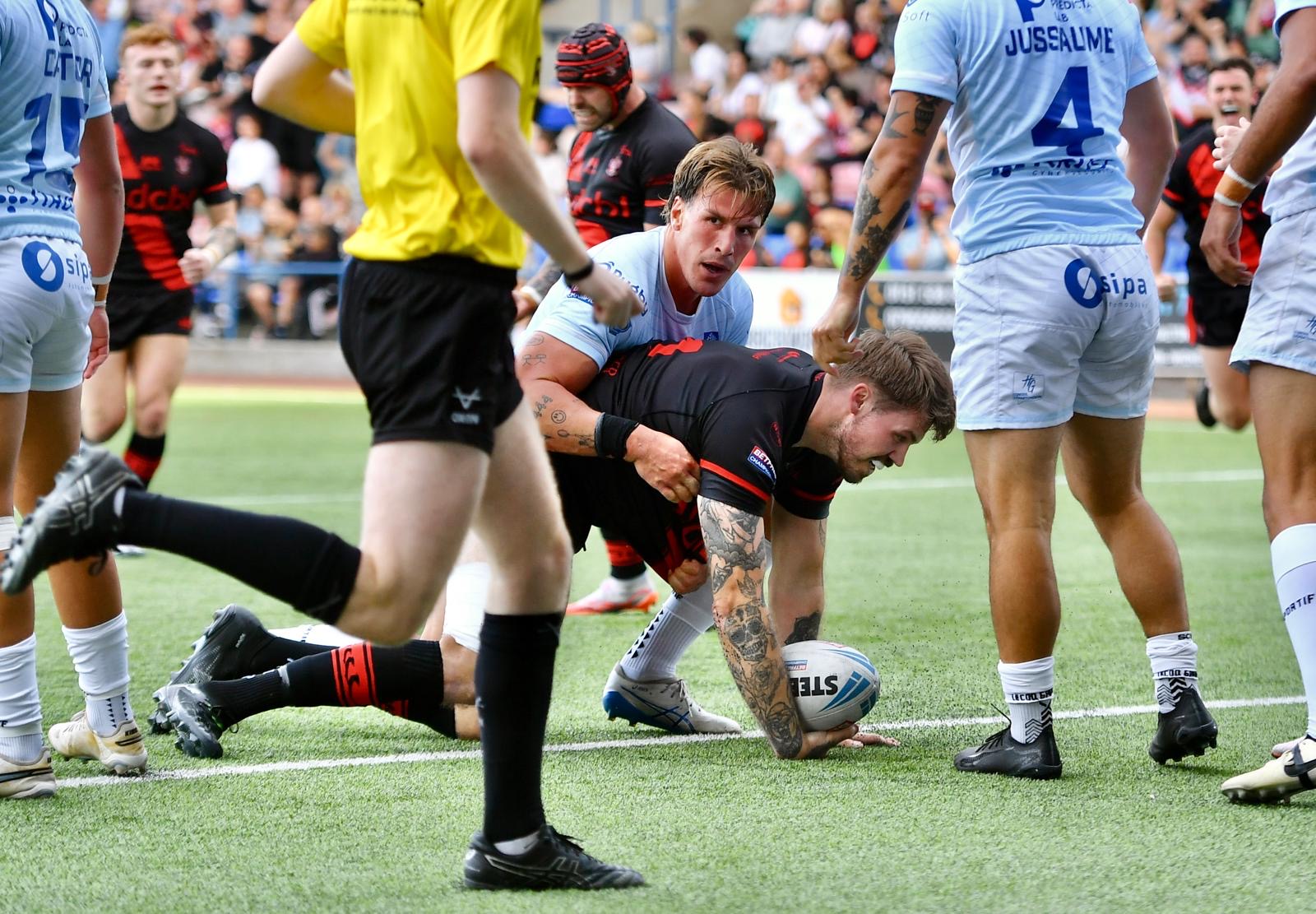 Liam Bent produced a series of crucial tackles, including a brilliant try-saver around the ankles of James Roumanos. Moments later, Andrew Badrock came up with a huge effort to haul down Mathieu Jussaume inches short of the line.
