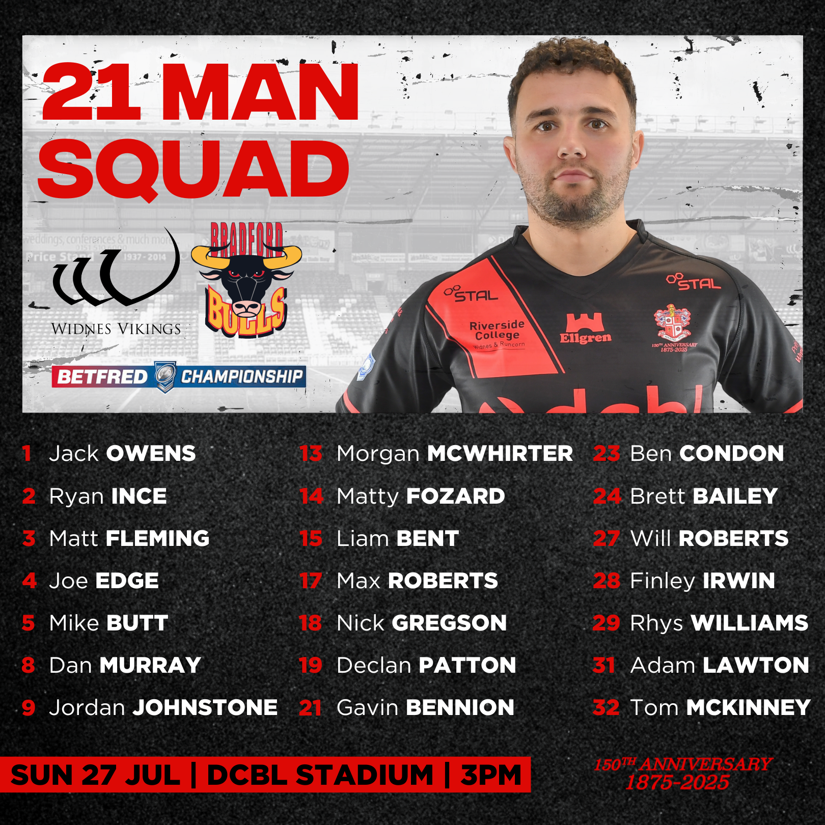 Allan Coleman has named his 21-man squad for Sunday’s clash with Bradford Bulls at the DCBL Stadium.