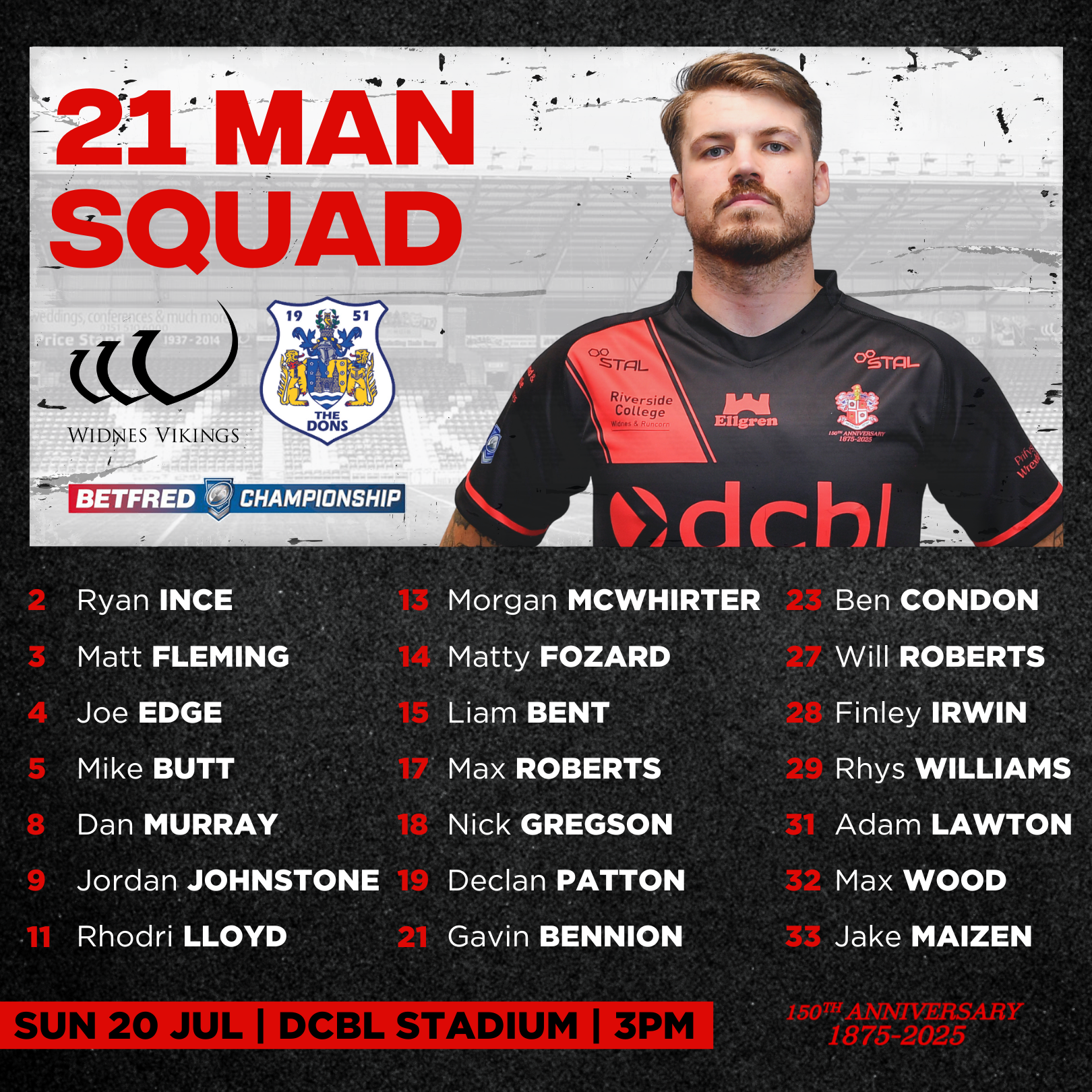 Allan Coleman has named his 21-man squad for Sunday’s clash with Doncaster at the DCBL Stadium.